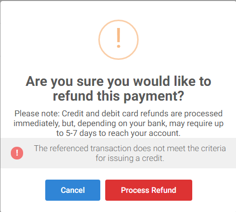 Only payments submitted within the last 6 months can be refunded . If you receive an error stating "The referenced transaction does not meet the criteria for issuing a credit.", you will need to contact support with your PayPal address in order to receive a refund.